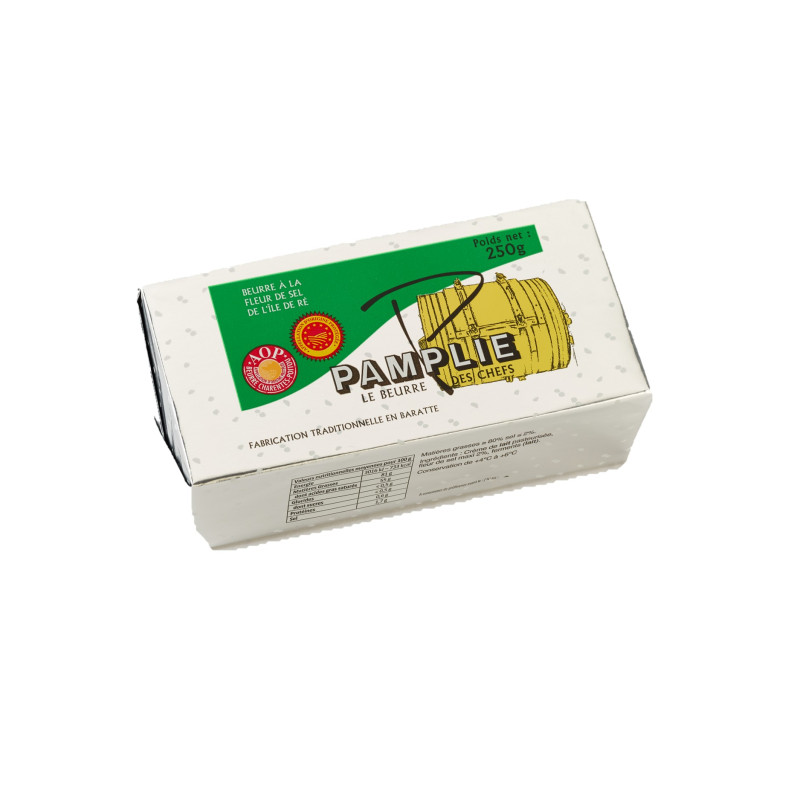 A recipe unchanged since 1905, made in churn barrel, the dairy Cooperative of Pamplie offers a range of butters, with a delicate and exceptional taste, unsalted, salted, fleur de sel and salt crystals, for retail, dairy shops, restaurants, pastry and bakery shops.