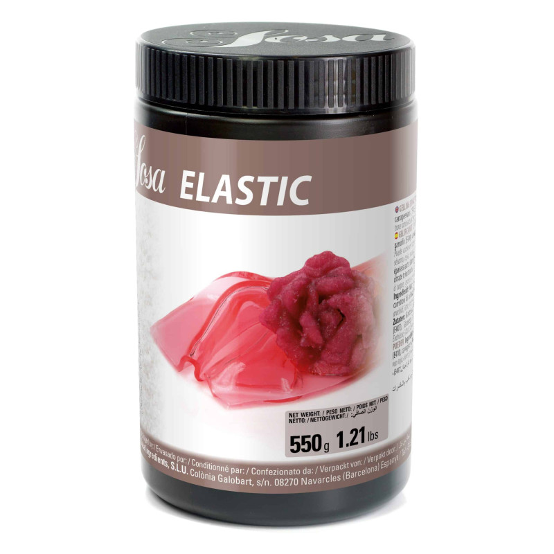 Elastic is a powdered, vegetarian gelling agent made from carob bean gum and carrageenan that creates a flexible, elastic gel suitable for hot or cold applications.