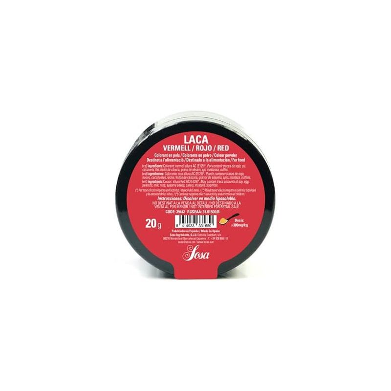 SOSA fat-soluble red powder coloring (20g) is a red food dye, made with Allura Red AC (E129), for coloring fatty preparations like chocolates, oils, and creams. It should be dissolved directly into the fat base before incorporating it into the final product. The maximum dosage is ≤ 300 mg/kg. Product details.