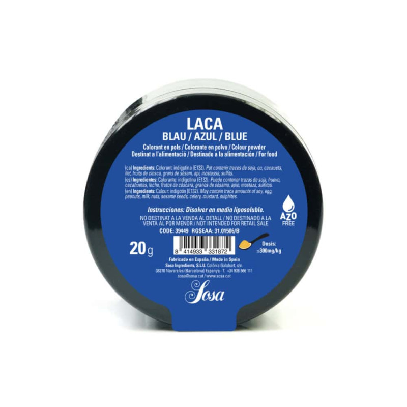 SOSA COLOURINGS FAT SOLUBLE POWDER 20G BLUE is a blue synthetic food-grade coloring powder for products containing fats. It is used to color fats, oils, chocolates, and fatty creams, and can be applied directly or dissolved in a fat base before mixing. It is recommended to use a maximum dosage of ≤ 300 mg/kg and to mix it into the fat base for uniform color.