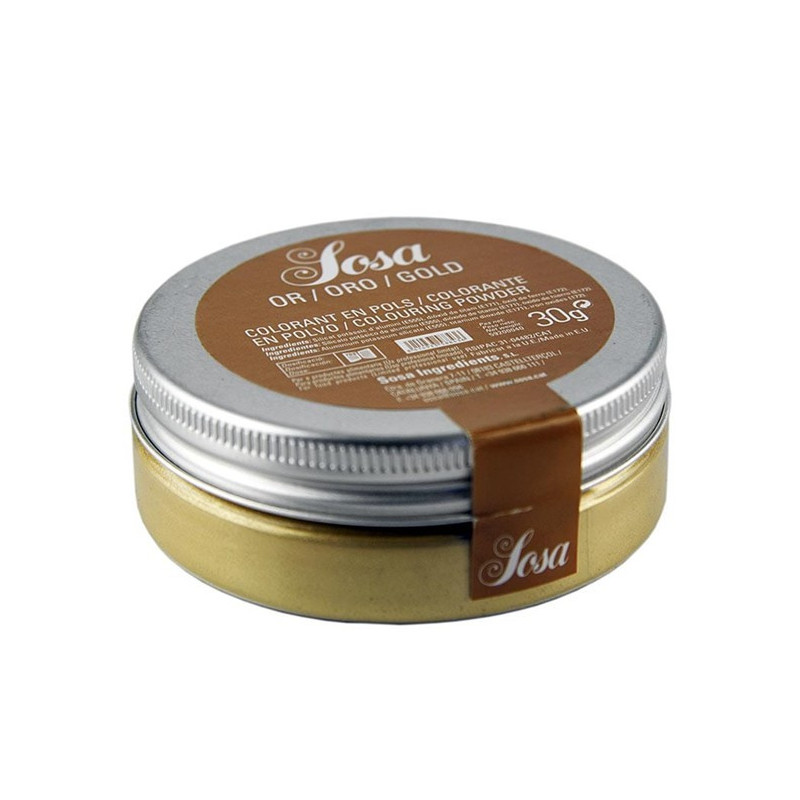 A food-grade, metallic, synthetic colorant from the Spanish brand SOSA, designed for adding a gold finish to various foods, usable dry for dusting sugar work or mixed into white chocolate, creams, glazes, and desserts, offering versatility for both sweet and decorative culinary applications.