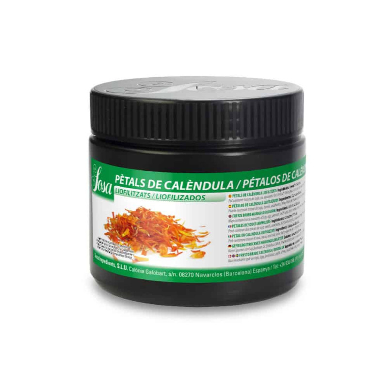 SOSA Freeze-Dried Marigold Petals are vibrant, delicately textured petals with a subtle peppery-citrus flavor, preserved by freeze-drying to maintain their shape and color.