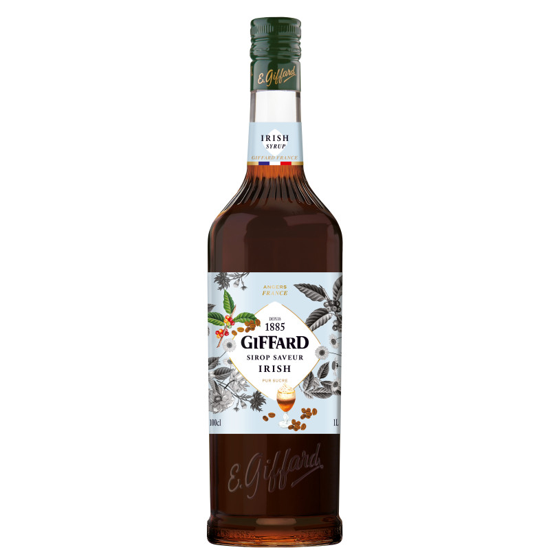 The Giffard Irish syrup is a non-alcoholic, pure sugar syrup that evokes the flavor profile of Irish coffee, primarily for use in non-alcoholic drinks, coffees, and cocktails. It offers a complex taste profile that mimics an Irish coffee.