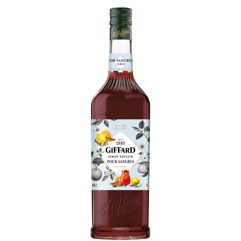 Giffard Sangria syrup has a red garnet color with brick red hues. The scent features fruity aromas of orange, sweet spices, and citrus peels. Its taste is slightly tart with orange and lemon notes, along with hints of cinnamon, vanilla, and nutmeg.
