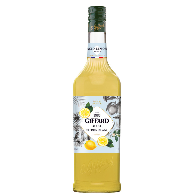 Giffard Acid Lemon is a pure sugar syrup made from concentrated lemon juice and natural lemon flavoring, with a balance of sweetness and the natural acidity of lemon. It is used in cocktails, mocktails, lemonades, and other fizzy drinks. The syrup is opaque and yellow, with a flavor that includes hints of bitterness, elderflower, and mint, and is designed to be diluted with water or sparkling water