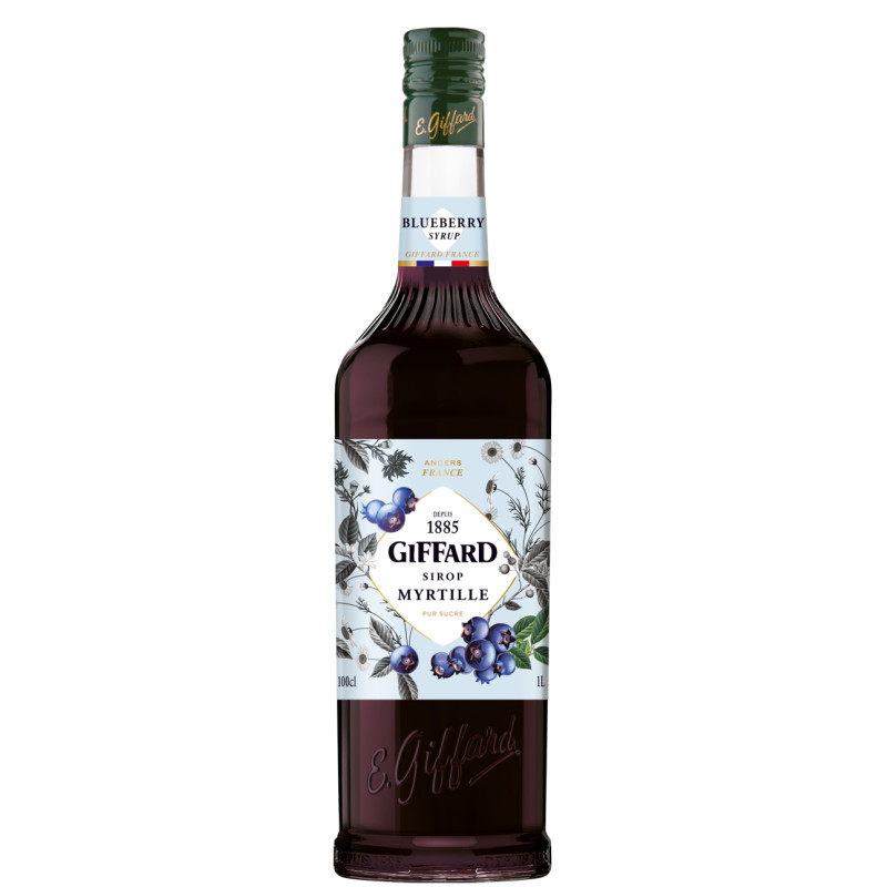 Giffard Blueberry syrup is a pure sugar syrup made with concentrated blueberry juice and natural extracts, creating a sweet, slightly acidic, and fruity flavor with a deep purple-red color. It is versatile and can be used in both alcoholic and non-alcoholic drinks like cocktails, lemonades, and iced teas, as well as in desserts, milkshakes, and as an ice cream topping.