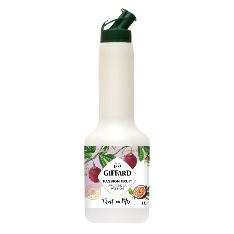 Giffard Passion Fruit For Mix made with passion fruit juice and pulp, sugar beet alcohol, and sweetened with sugar beet sugar. It has a strong, tart, and musky passion fruit aroma with hints of guava and Mandarin orange, and its flavor profile is balanced between sweet and sour with a slightly astringent finish from the seeds.