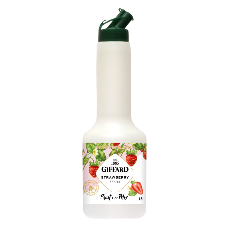 Giffard Strawberry Fruit for Mix offering an authentic taste of fresh strawberries with a sweet and sour profile. It is used in cocktails, mocktails, smoothies, and desserts, and its slow-flowing texture with visible achenes (seeds) adds a natural appearance and texture.