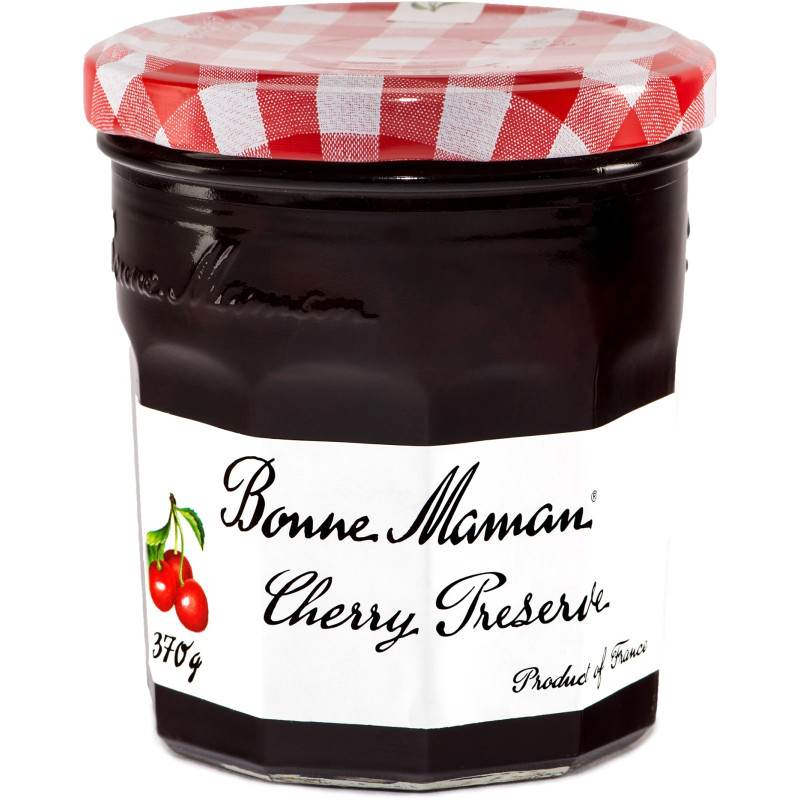 Bonne Maman Red Cherry Jam is a natural French preserve made with real cherry chunks, sugar, lemon juice, and fruit pectin, boasting a sweet, tangy taste with authentic fruit pieces, free from artificial colors or preservatives, perfect for toast, yogurt, or baking.